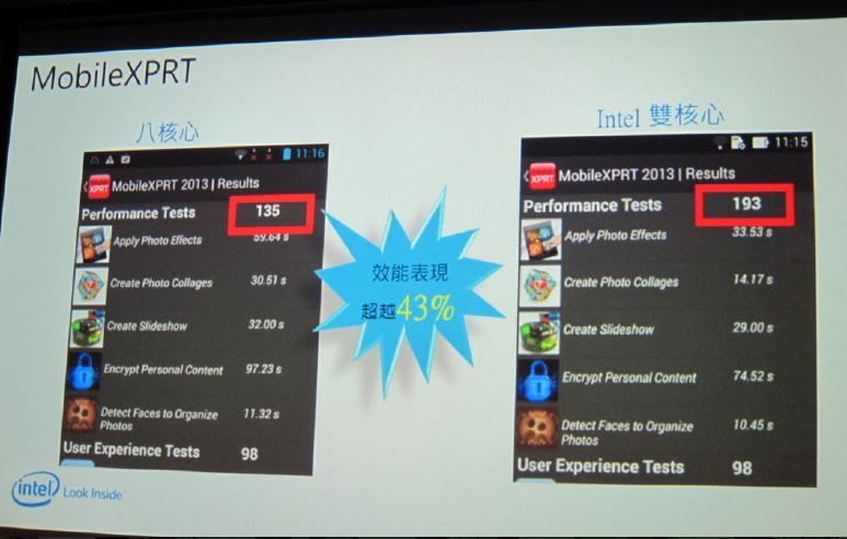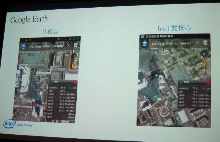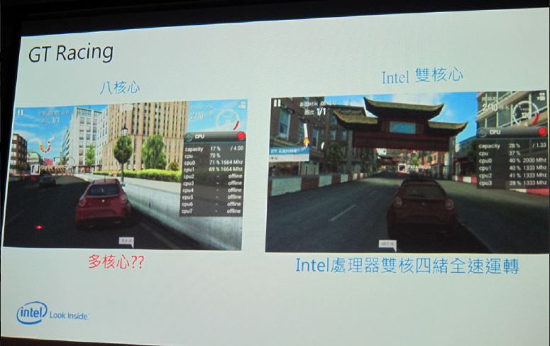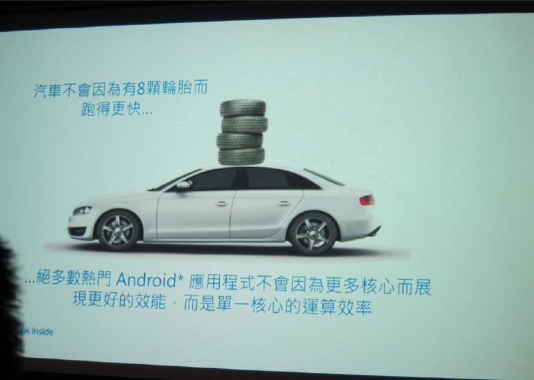 接著Jim和我們介紹Intel inside的手機優勢,智慧型手機從雙核心、四核心一直到現在的八核心,一般我們的思維是核心數字越大代表的就是速度越快或者功能越優,不瞞大家,小編也是有這種迷思,聽完Jim的說明後,我也終於懂了為什麼有些大廠紛紛推出八核心的手機,但市場的確還是一直推出雙核心的新手機的原因,而且雙核心的效能不會輸給八核心唷!!以後買手機時不要被核心的數字大小給騙走了,而是要了解手機所搭載的處理器,這才是影響手機快慢的關鍵。就跟下圖一樣,汽車不會因為8顆輪胎就跑得比較快,同理可證,Android應用程式不會因為更多核心而展現更快的效能,重要的是單一核心的運算效率。